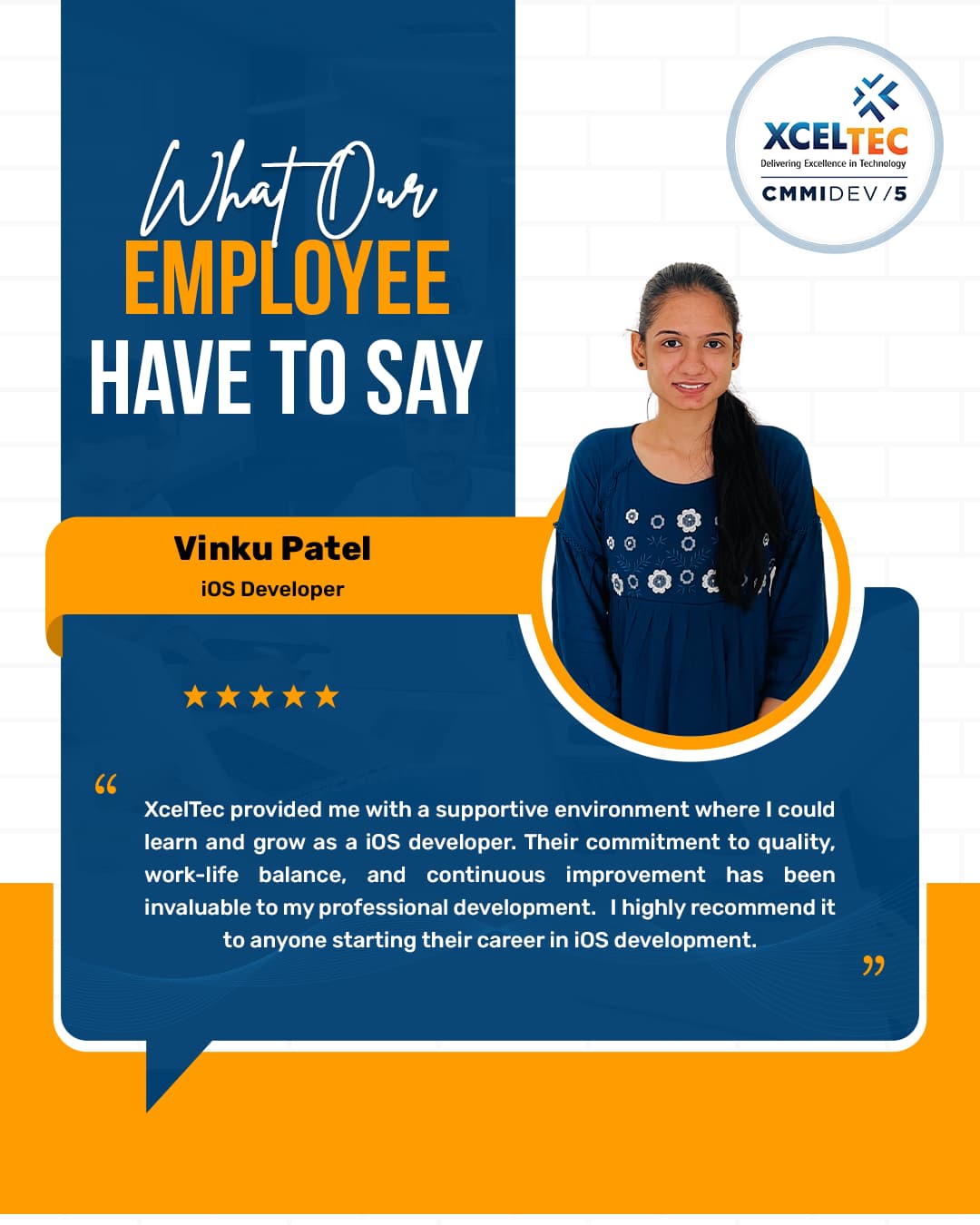 Meet Vinku Patel, our talented iOS developer here at XcelTec! In this insightful video, she shares her valuable experiences while working with us.